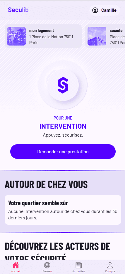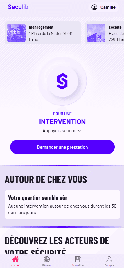 Vous recevez une notification, mais que faire si vous êtes loin de chez vous ? Pas de déplacement possible, pas de proches disponibles, et les forces de l’ordre n’interviennent pas sans vérification physique. Lorsque vous recevez une alerte de votre système de surveillance, vous pouvez vous rendre sur l’application Seculib et effectuer une demande d’intervention en quelques clics. Vous êtes libre de choisir le système de surveillance de votre choix et de lancer des interventions lorsque vous le souhaitez, sans aucune contrainte.