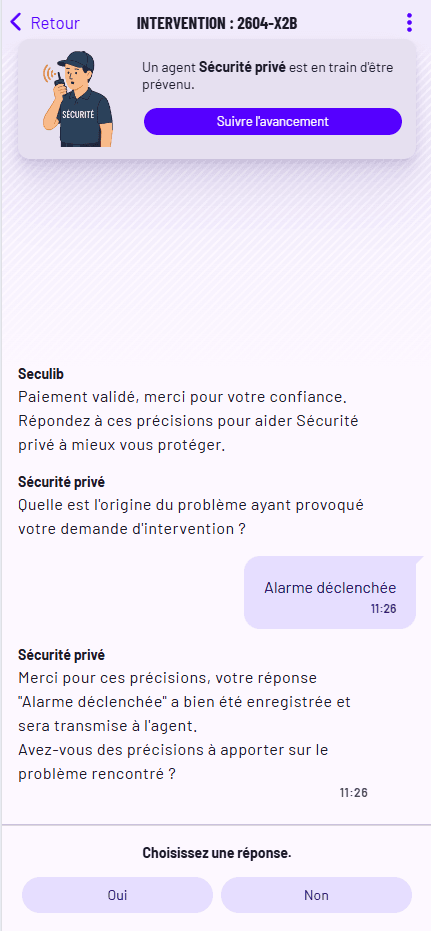 Depuis l’app, suivez l’intervention en direct, échangez avec l’agent si besoin et recevez un compte rendu à la fin.